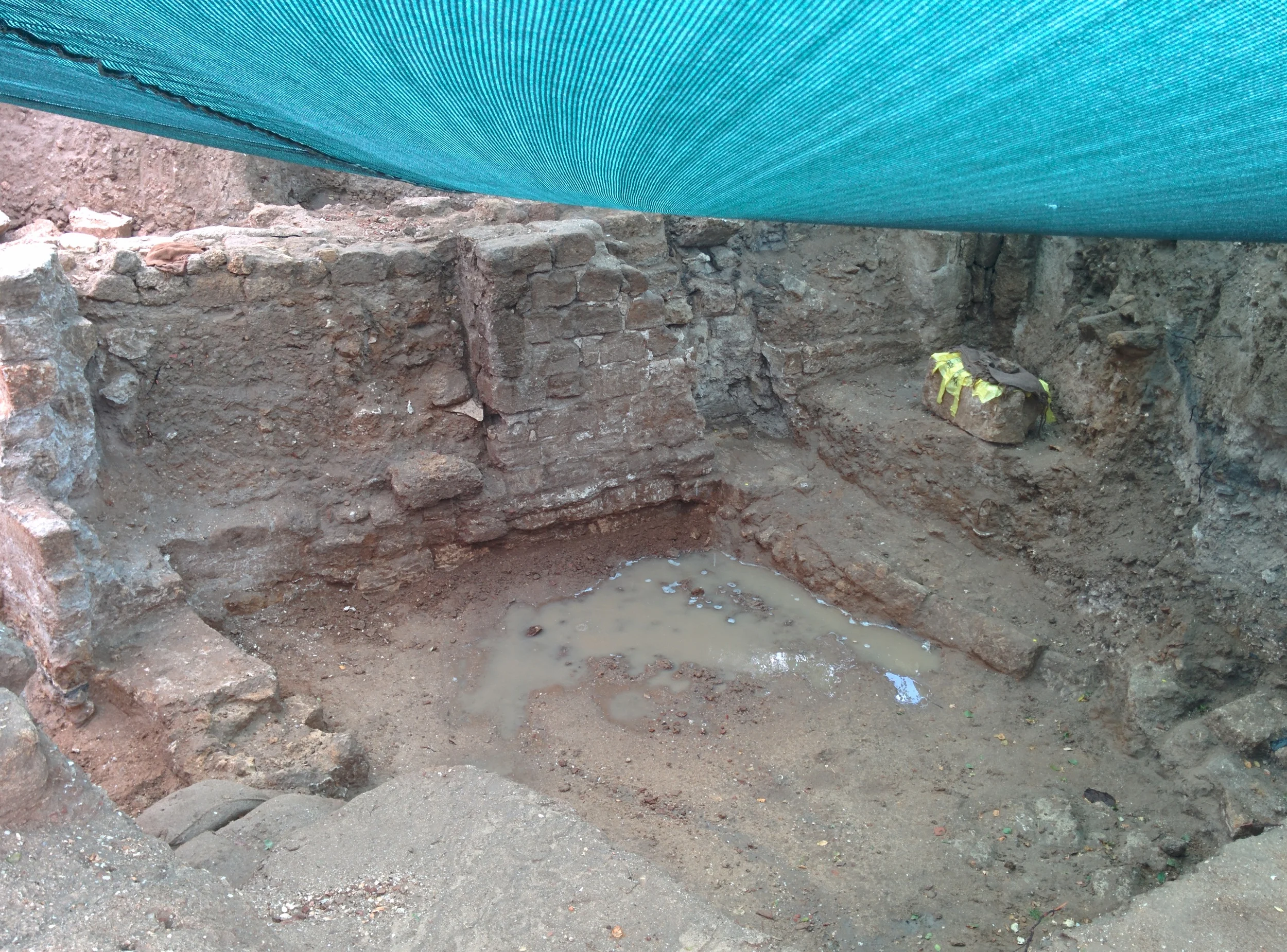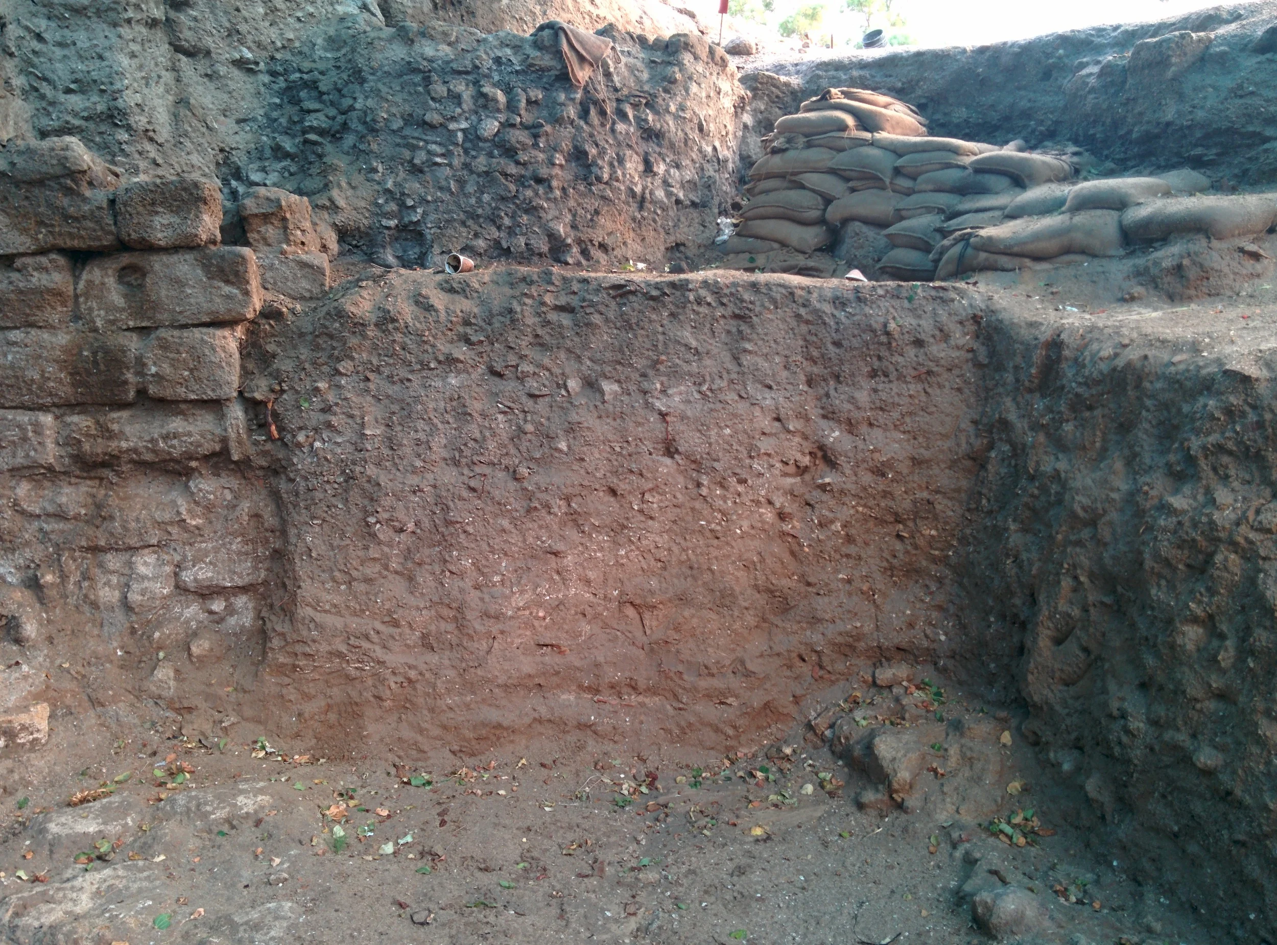 Here is a view to the north. It's easy to see the large cut in section ending at the cut portion of wall U66 at left. This may have been to clear rubble before installation of the cistern. The cistern is the installation at the top of the picture (look for the empty sandbags).