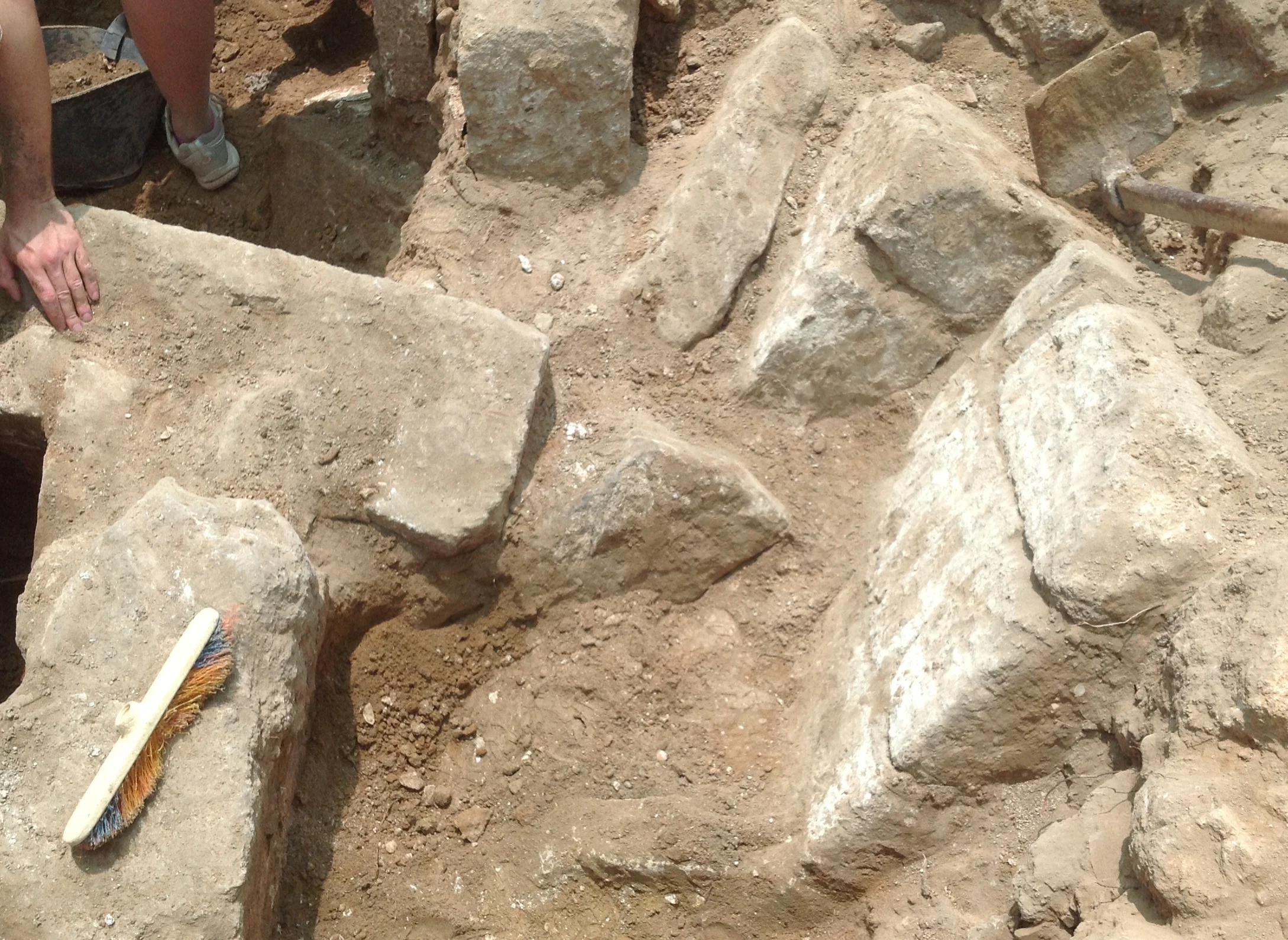 Looks like a big pile of stones, right? Well, that tells only half the story. What makes this "pile of stones" so interesting is that it consists of a number of wall fragments -- walls that were once cemented together -- some of which still have their plaster facing in place. They are a surprising, and interesting, find because such stones were prized building materials and we seldom find them abandoned and unused. These stones were, in fact, buried under a large leveling fill and completely ignored. We hope to learn more about them as we continue to expose more in the coming days. Were they part of a building that was demolished? Did the building they come from collapse in a natural event such as an earthquake? If we're lucky, we'll be able to answer these and many other questions.
