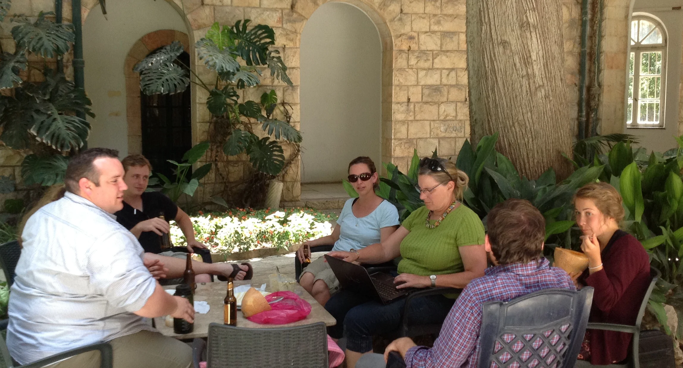 The staff is back at work today in the courtyard and basement lab of the W. F. Albright Institute of Archaeological Research in Jerusalem. Objects are getting processed, bookwork completed, and articles written. Time was taken to enjoy pita and hummus from Abu Hassan's -- delicious -- and then it was back to work.