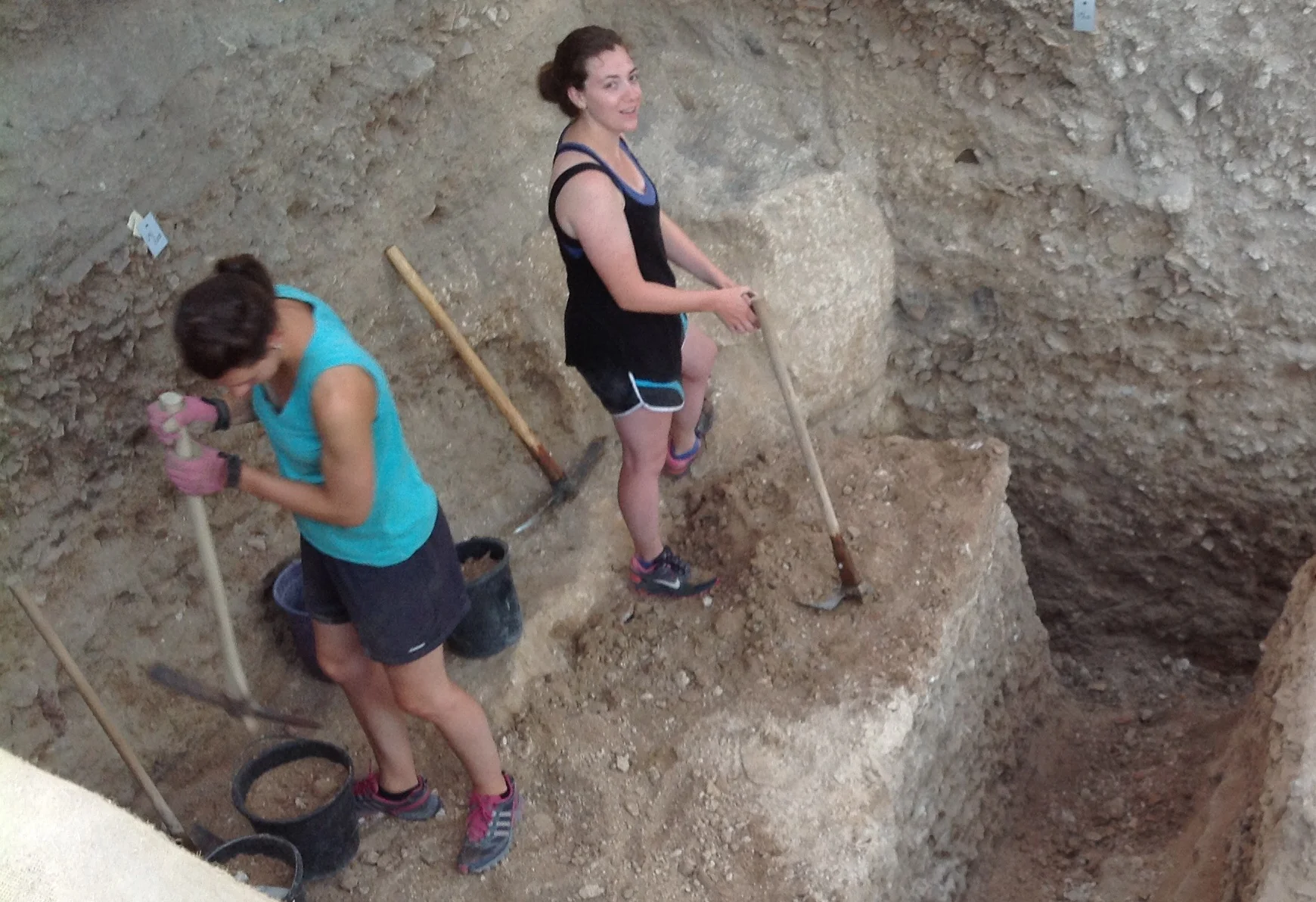 Here is a picture of the mudbrick structure in Grid 16 -- it's the yellow blocks you see towards the back of the picture. What is it? Only time and more excavation will tell. How old is it? Well, they're working on it though the answer is still early.