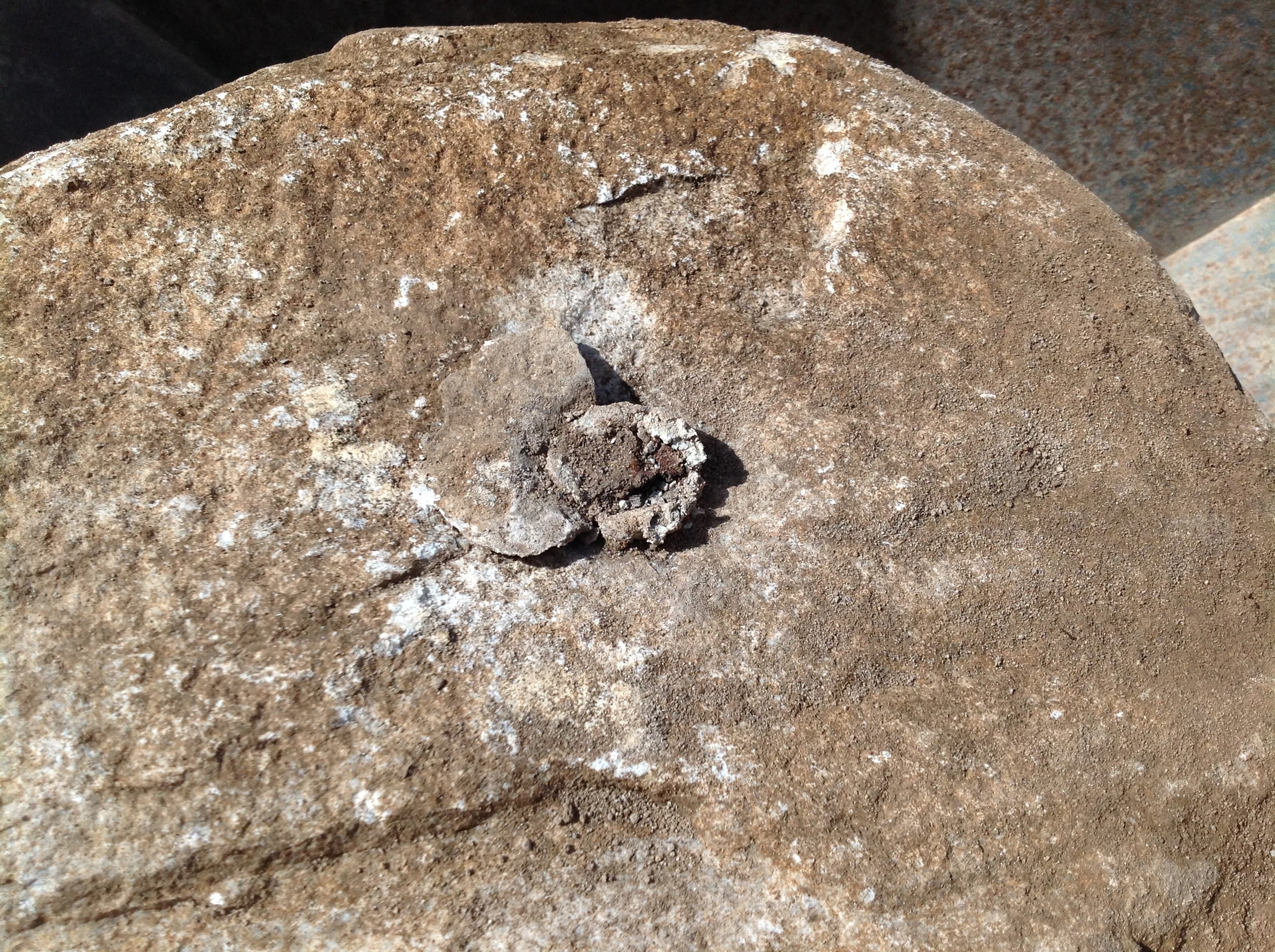 About that mystery object, the one about which "at least two supervisors" got very excited. It's a column base we found dumped into a water cistern, visible on the left side of the picture above, excavated in Grid 32. The reason why it is so exciting is the material found at the center of the column base.